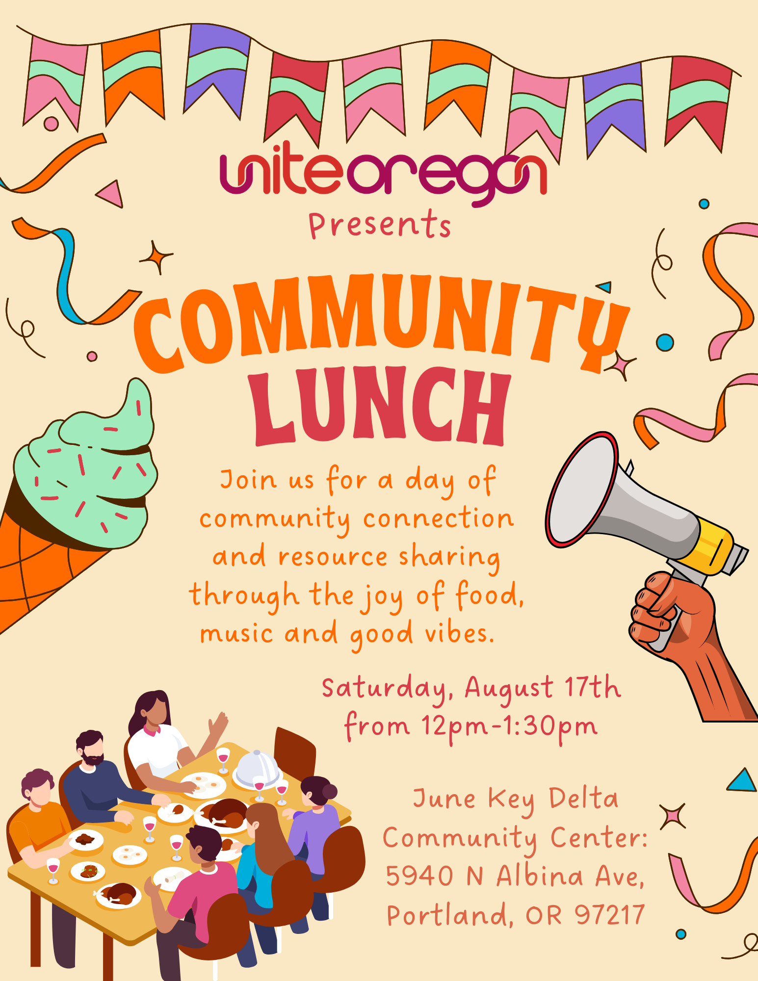 Join us on Saturday, August 17th for a community lunch to meet members and staff of our Multnomah County Chapter. The event takes place at the June Key Delta Community Center from 12:00 pm-1:30 pm. Come out for community connection and resource sharing through the joy of food, music, and good vibes!